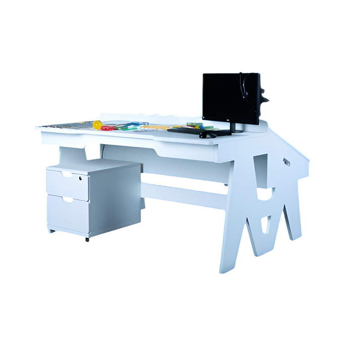 Рациональное оснащение. В комплектацию стола входит не только рабочее место специалиста с компьютером, но и детский стол со встроенной сенсорной панелью, акриловое зеркало, отсек для песочной терапии и полная тумба методических пособий и лого-инвентаря. Всё это обеспечивает максимальный комфорт и эффективность работы.