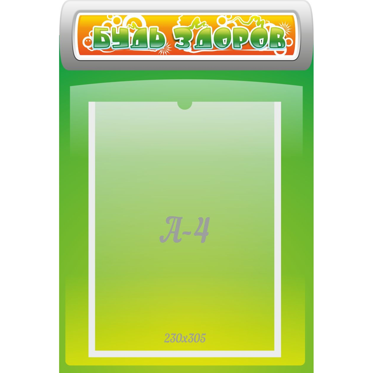 Информационный стенд, в котором можно поместить информацию о закаливающих процедурах или профилактике вирусных заболеваний. Фон стенда оформлен в зеленой цветовой гамме. В оформлении текста используются заглавные буквы зеленого цвета. Это позволяет сделать стенд заметным издалека. Стенд выполнен из высококачественного материала. Фурнитура стенда прочная, что позволяет надежно закрепить его на стене. Стенд имеет один информационный карман, изготовленный из прочного пластика. Карман рассчитан на многократную замену листов. Стенд своим дизайном дополнит любой интерьер.