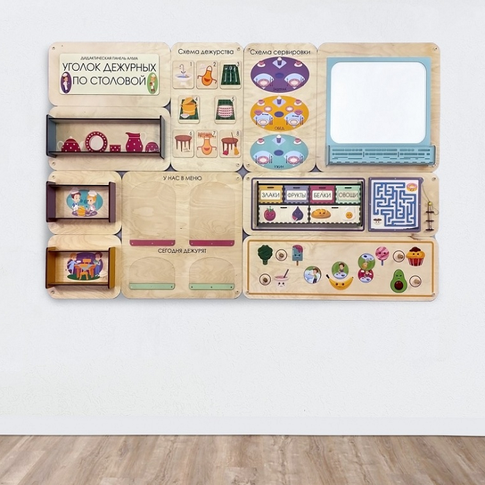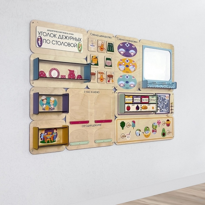 • Занятия с панелью «Уголок дежурных по столовой» нацелены познакомить детей с меню питания, графиком дежурств, полезными продуктами, правильным поведением за столом. Дети приобщаются к посильной работе, учатся заботиться о коллективе.