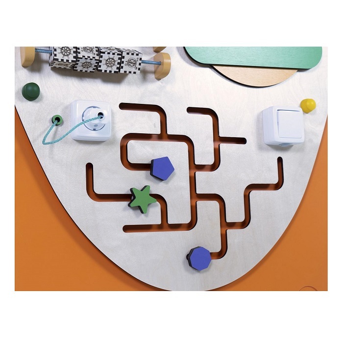 Бизиборд предназначен для детских учебных учреждений, для изучения геометрических фигур (форма, количество углов, вид, цвет, особенности). Задачи строятся по принципу «от простого к сложному». Например, пройдя простые лабиринты, можно перейти к более запутанным.