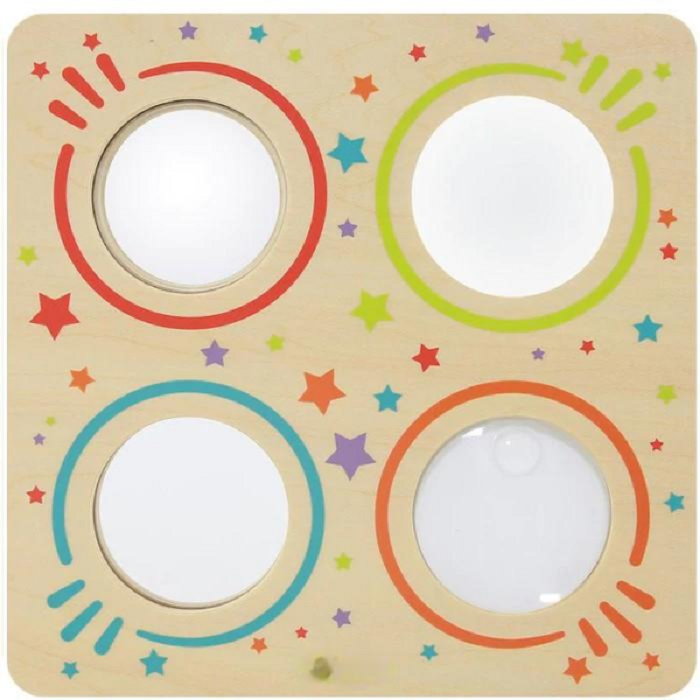 Панель для визуального восприятия состоит из вогнутой линзы, выпуклой линзы, лупы и зеркала. Хорошая наглядная развивающая игрушка, с которой детям будет весело.