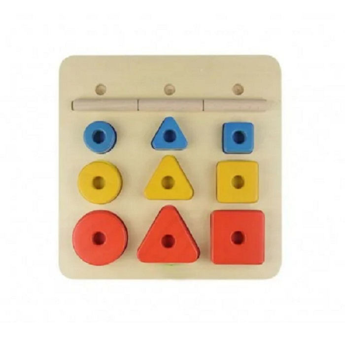 На лицевой стороне панели расположены геометрические фигуры с отверстиями (треугольники, квадраты, круги — различных размеров) и стержни. В процессе игры, ребенок учится сортировать по цвету, фигурам и размеру. Панель выполнена из березовой фанеры.