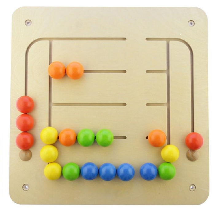 Настенная панель выполнена из березовой фанеры, на лицевой части выполнены прорези в виде лабиринта, в которых подвижно закреплены 5 групп из 4 шариков в 5 ярких цветах.