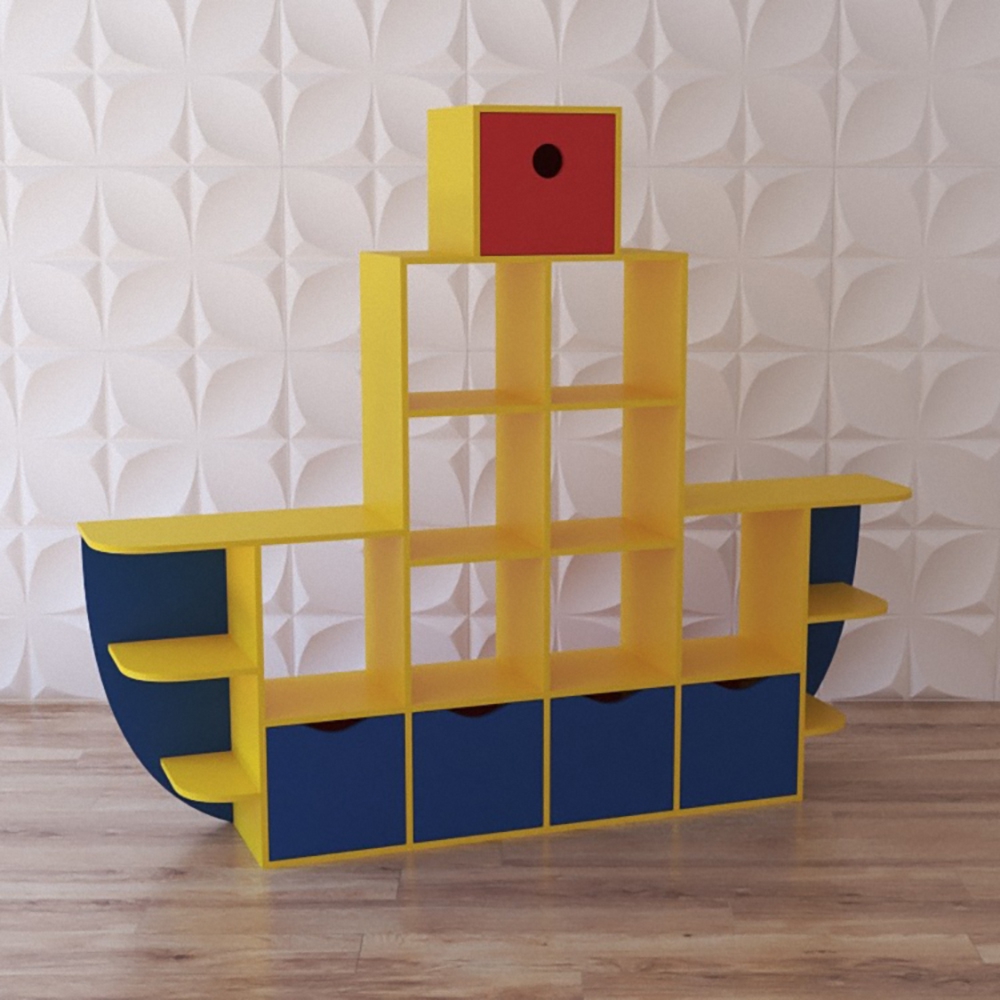 Шкаф-стеллаж представленной модели выполнен в форме корабля, имеет 16 открытых и 5 закрытых полочек, окрашен в желто-синей гамме с одиночным красным акцентом. Благодаря продуманной конструкции стеллажа хранение станет организованным и займёт намного меньше места. Стеллаж для игрушек станет отличным модулем для оснащения помещений и украсит любое помещение за счёт своего яркого и необычного внешнего вида. Этот яркий модуль предусмотрен для группы детсада, яслей, но также будет одинаково хорошо смотреться в игровом детском уголке кафе или дома в детской у малыша.