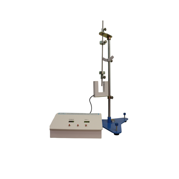 Лабораторная установка «Определение ускорения свободного падения методом оборотного физического маятника» представляет собой юстируемое основание с установленным вертикальным стержнем, на котором закреплен оптический датчик с регулировкой высоты и опорный кронштейн, на который опирается опорная призма физического маятника. Опорный кронштейн свободно перемещается по стержню, что позволяет изменять плечо маятника. Для отсчета времени колебаний маятника используется электронный секундомер.