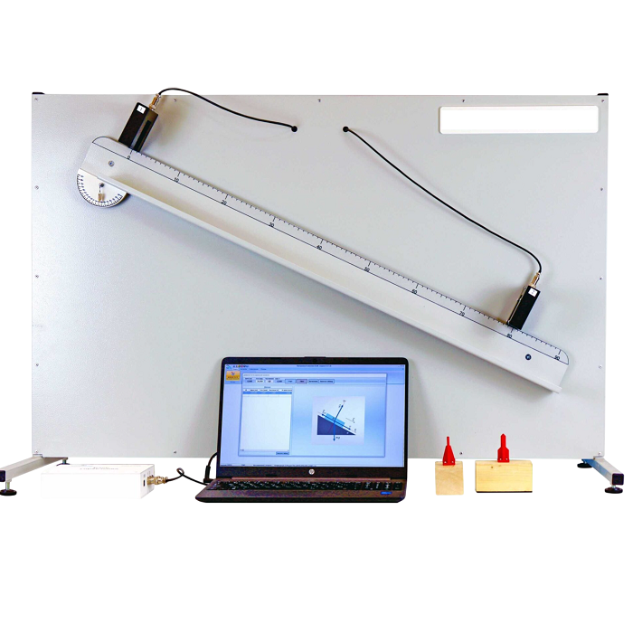 Направляющая рейка и датчики имеют магнитное крепление к стенду. В комплект входят два бруска с различными скользящими поверхностями -