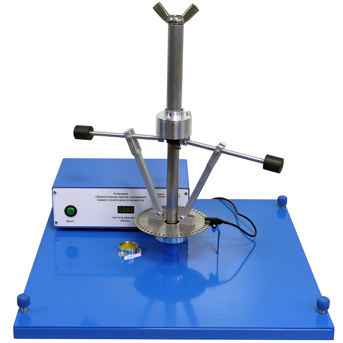 Лабораторная установка предназначена для демонстрации закона сохранения осевого кинетического момента вращающейся системы, определения осевого кинетического момента механической системы.