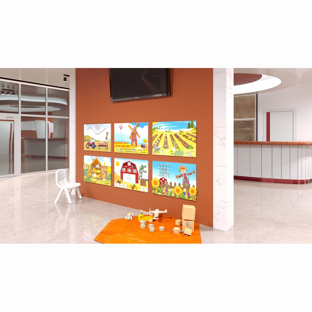 Комплект настенных панелей «Ферма» состоит из 6 частей прямоугольной формы, которые выполнены в одном размере и оформлены в единой цветовой гамме. На каждой панели изображены разные части домашнего фермерского хозяйства. Безопасно крепятся к стене, покрытие панелей наивысшего качества обеспечит безопасность при игре.